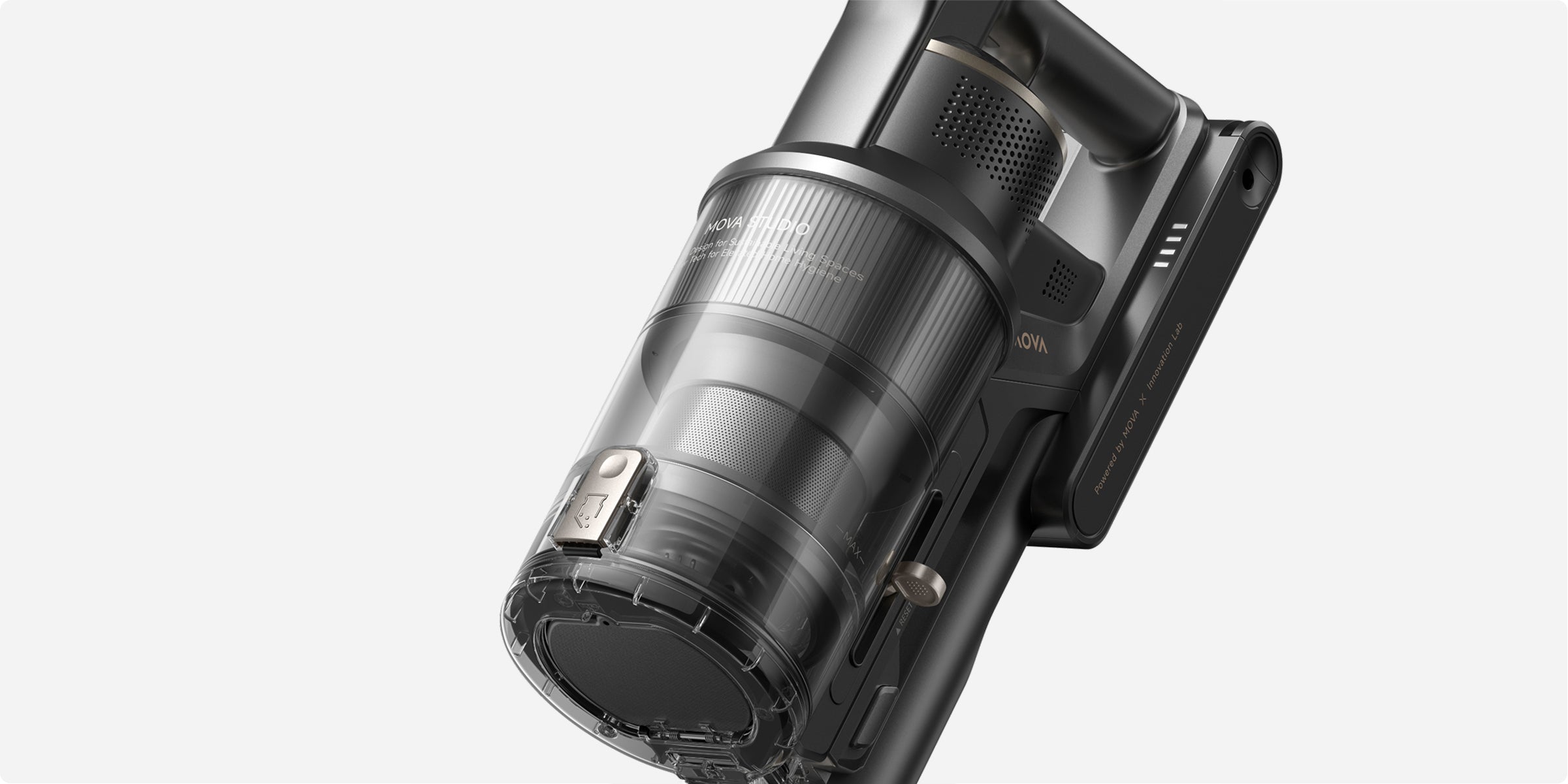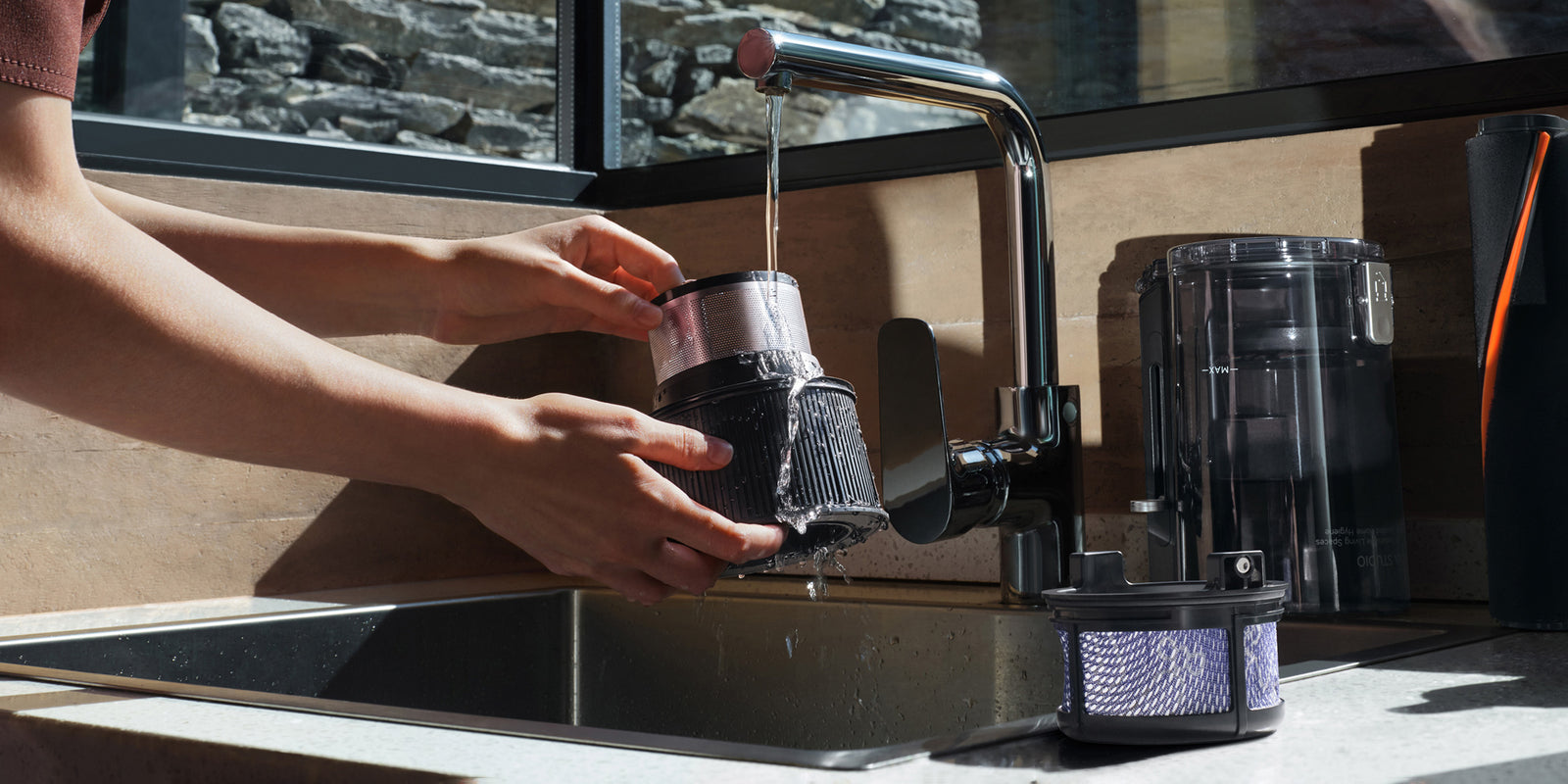 Stačí posunout nahoru – kovový filtr se zvedne a stírací kroužek setře prach, což zajistí stabilní sací výkon. Pro kompletní vyčištění stačí během pár sekund odejmout a opláchnout.