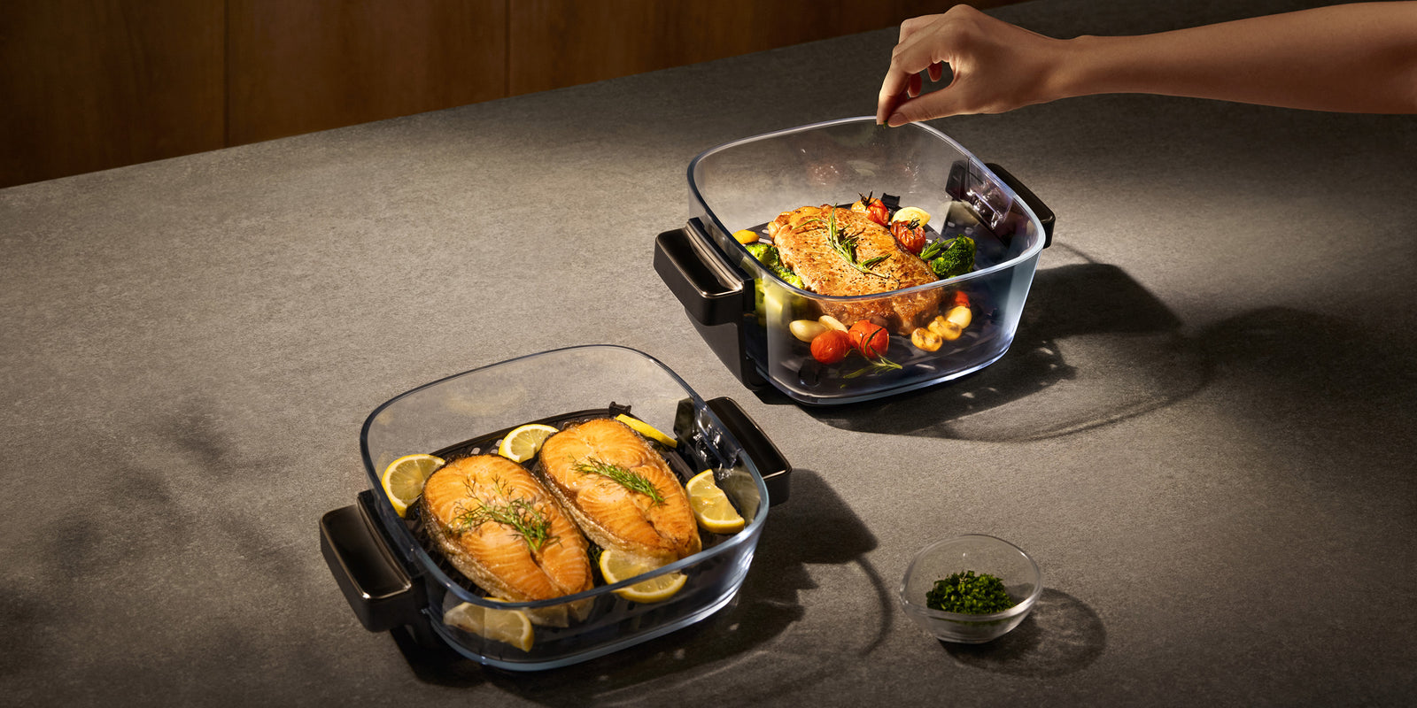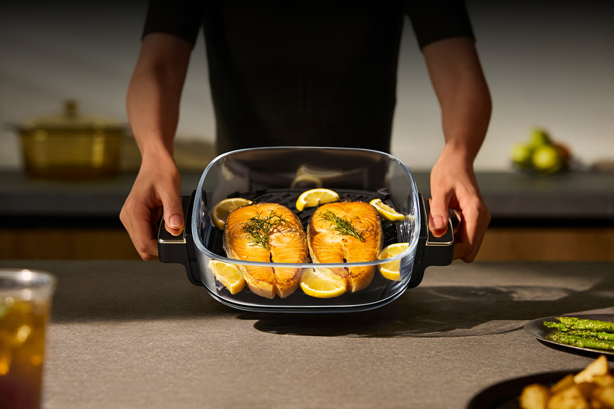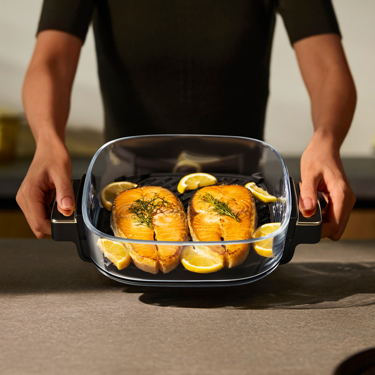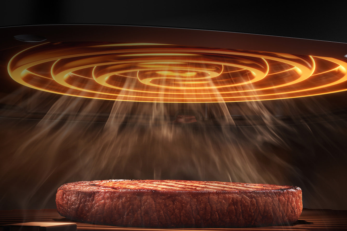 Bezkartáčový motor zajišťuje inteligentní cirkulaci vzduchu při vysoké rychlosti a upravuje proudění vzduchu podle potřeby tak, aby potraviny byly zvenku křupavé a uvnitř šťavnaté. Širší průduchy a vlnitá grilovací pánev napomáhají distribuci tepla.