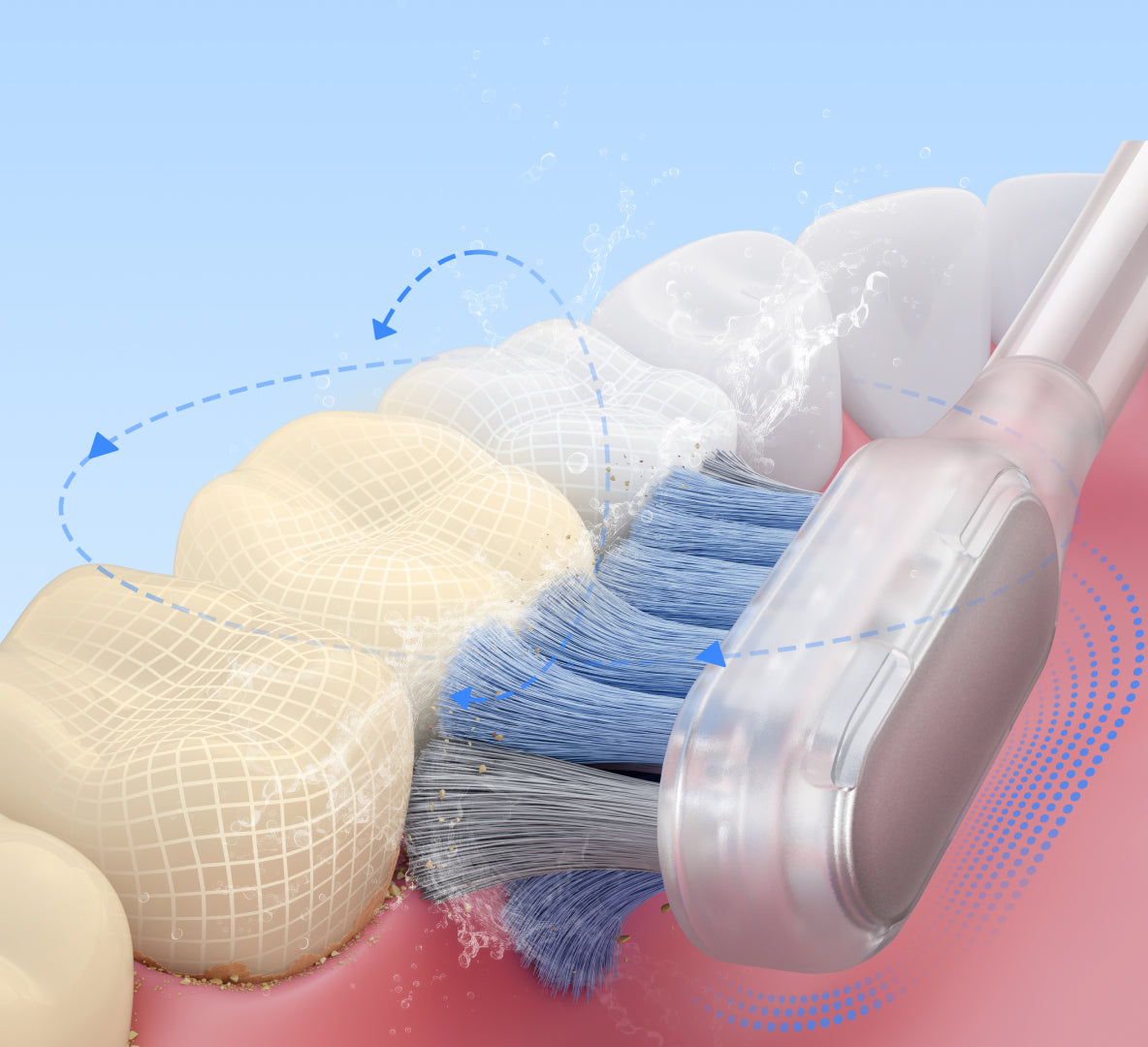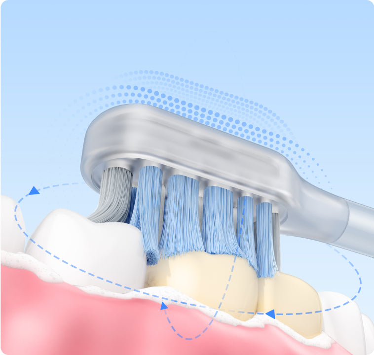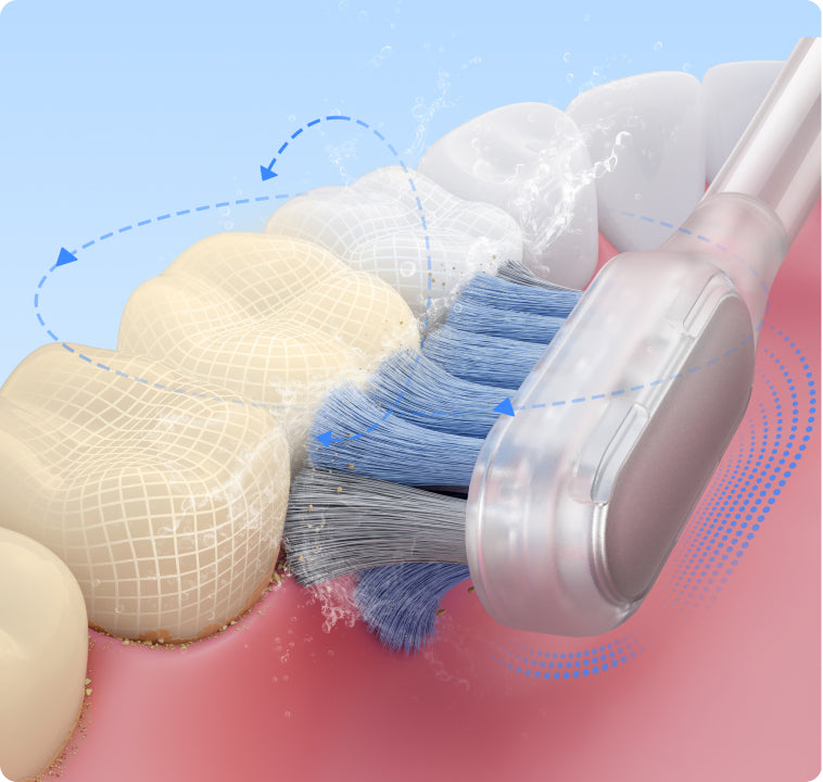 Rozšířené štětiny dosahují daleko ke zadním zubům do 0,01mm* do mezer mezi zuby a dásněmi, zatímco tvarované štětiny obklopující zuby efektivně čistí gingivální sulcus.