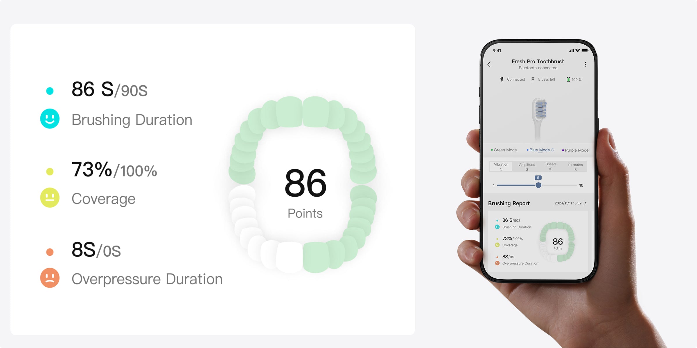 *30 dní: Na základě dvou minut čištění denně (Fresh Pro: jedna minuta ráno a večer; Fresh: dvě minuty ráno a večer) v standardním režimu. Na základě našich interních laboratorních dat. Skutečná účinnost se může lišit v závislosti na použití.