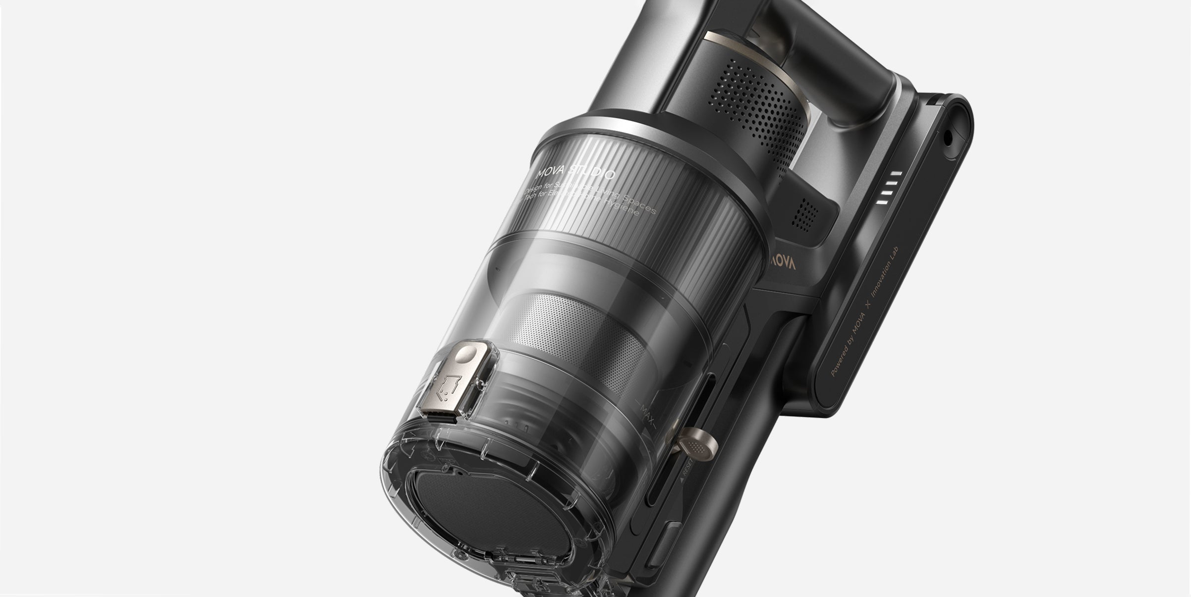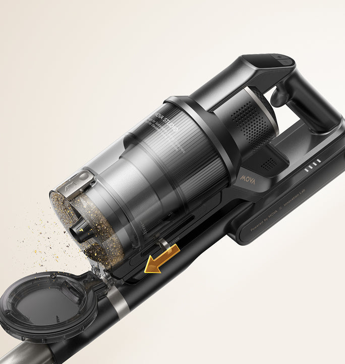 Stačí posunout nahoru – kovový filtr se zvedne a stírací kroužek setře prach, což zajistí stabilní sací výkon. Pro kompletní vyčištění stačí během pár sekund odejmout a opláchnout.