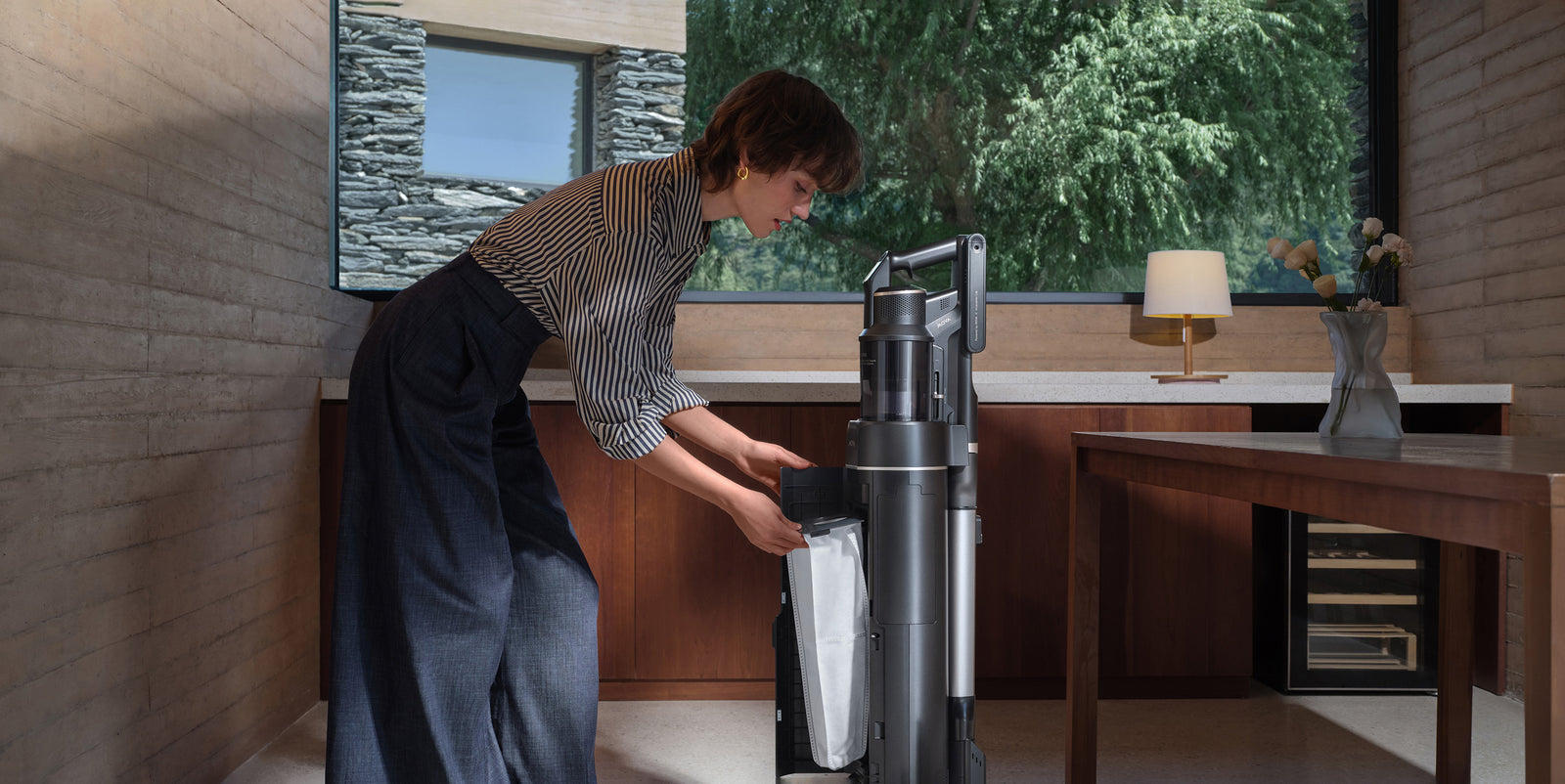 Automaticky vyprázdní vestavěnou nádobu na prach – aniž byste si špinili ruce. Antibakteriální prachový sáček odolný proti plísním o objemu 3 l pomáhá zachytit nečistoty, zabraňuje plísním a bakteriím a umožňuje používání bez ručního zásahu. Úložný stojan na příslušenství navíc zajišťuje dobrý přehled o nástavcích, které máte vždy na dosah.