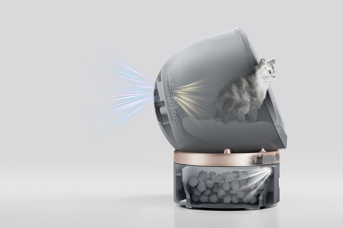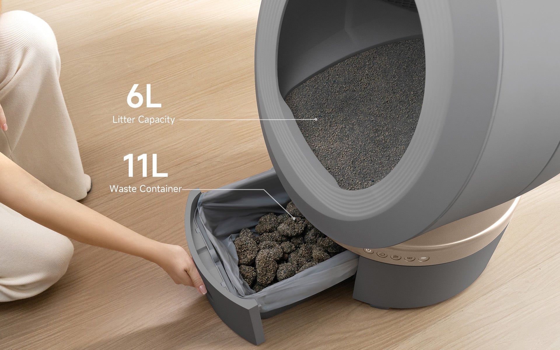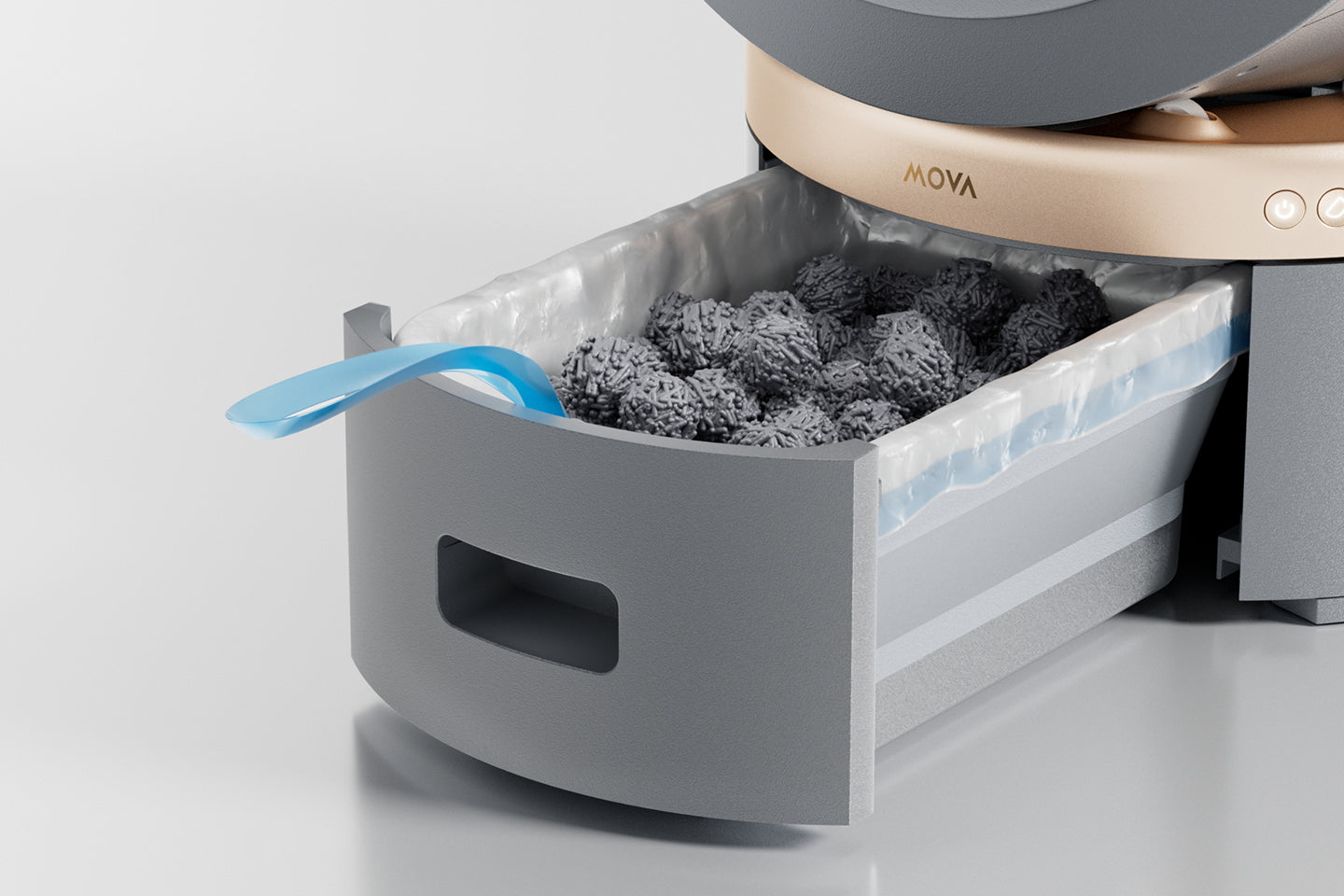 Rukojeť umístěná na vrchu umožňuje snadno vyjmout nádobku. Plastovou nádobu na odpad a podnos na stelivo lze během několika vteřin opláchnout a poté rychle nasadit zpět na místo, aniž byste se museli dotýkat kočičích výkalů.