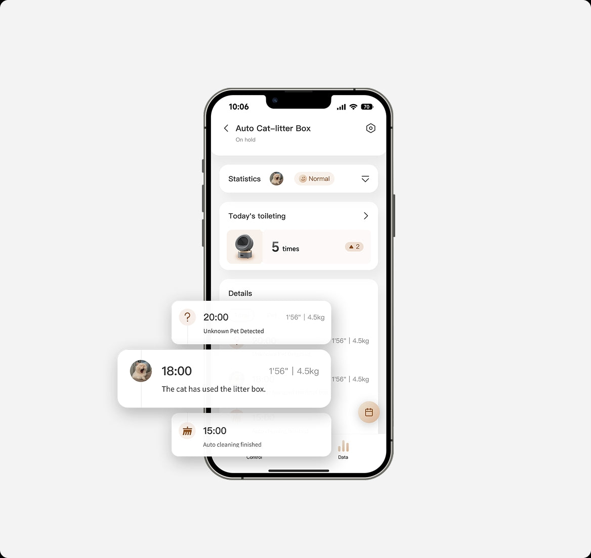 Podporuje správu profilů více koček prostřednictvím senzoru hmotnosti. Sleduje trendy hmotnosti a toaletní návyky každé kočky individuálně. Spravujte údaje o zvířatech dlouhodobě, detekujte abnormality včas pro snížení rizika onemocnění.