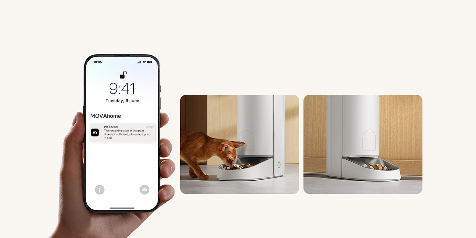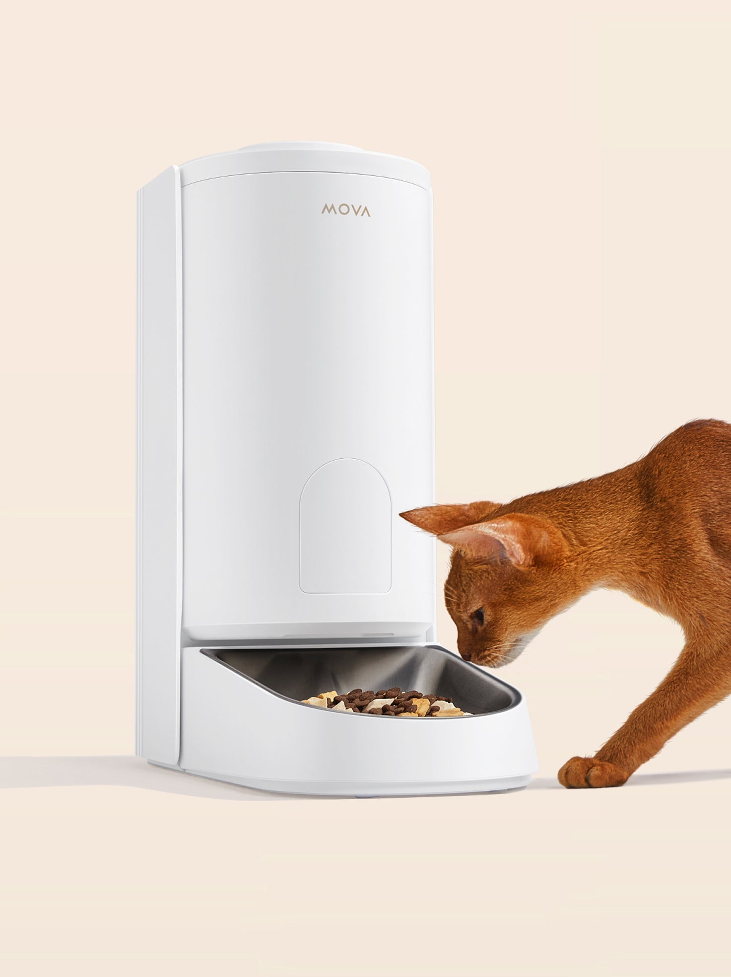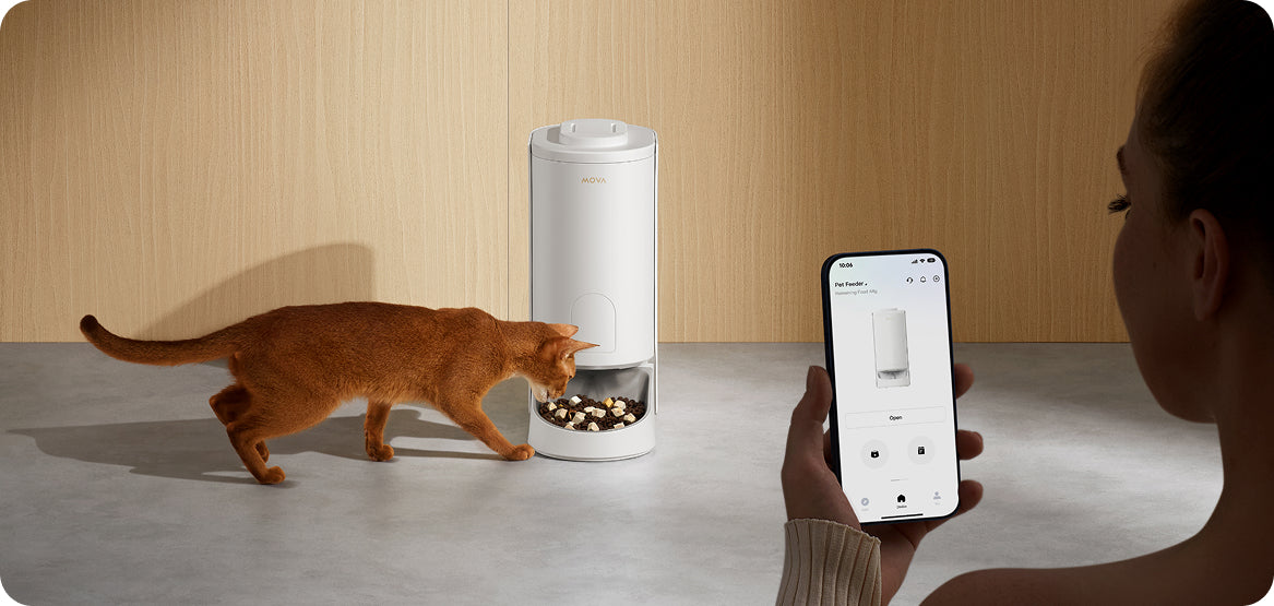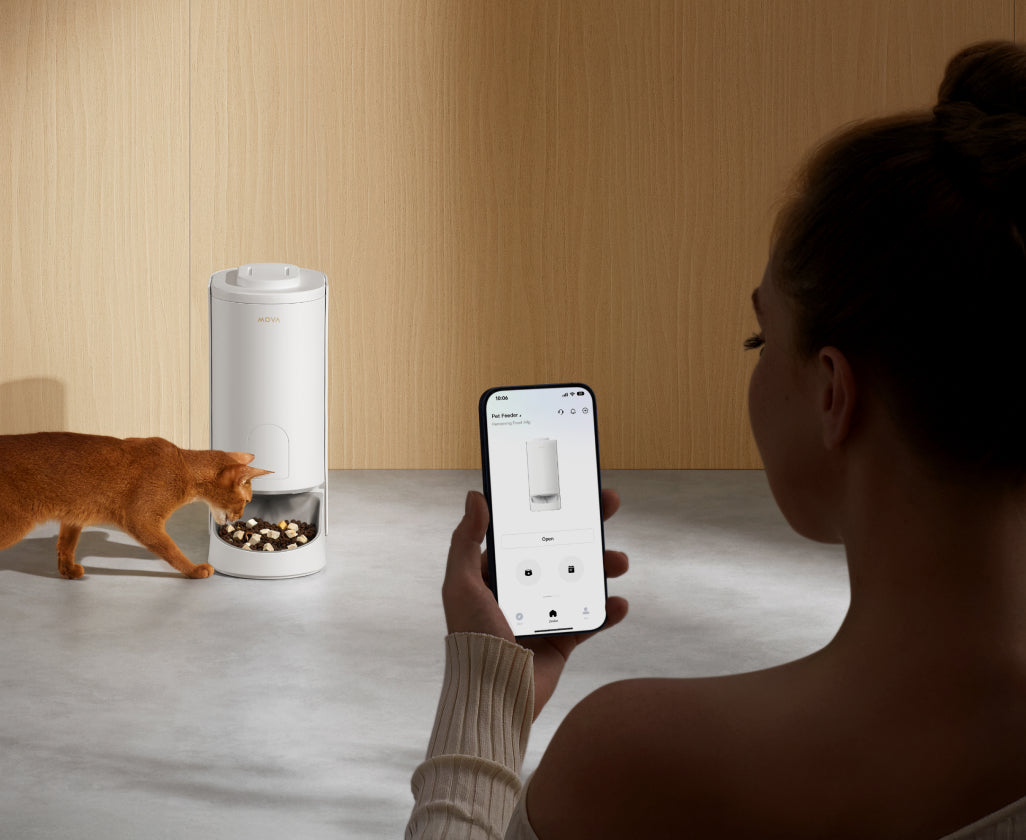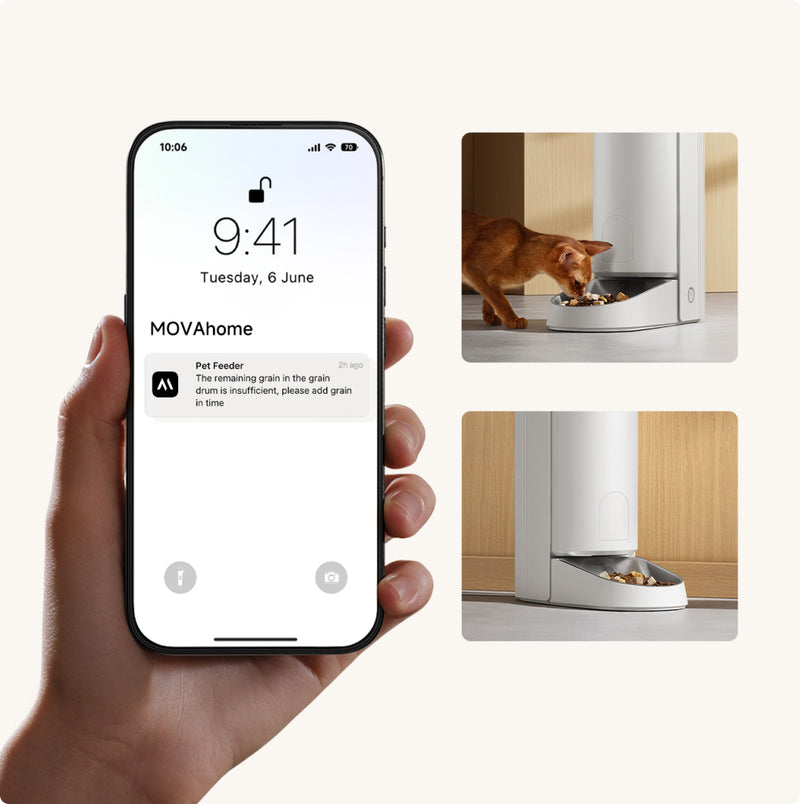 Snadno spravujte plán krmení vašeho mazlíčka pomocí aplikace MOVAhome, což zajišťuje, že vždy dostanou jídlo včas nastavením času a množství každého krmení. Jídlo můžete také manuálně dávkovat pomocí tlačítka na dně přístroje.