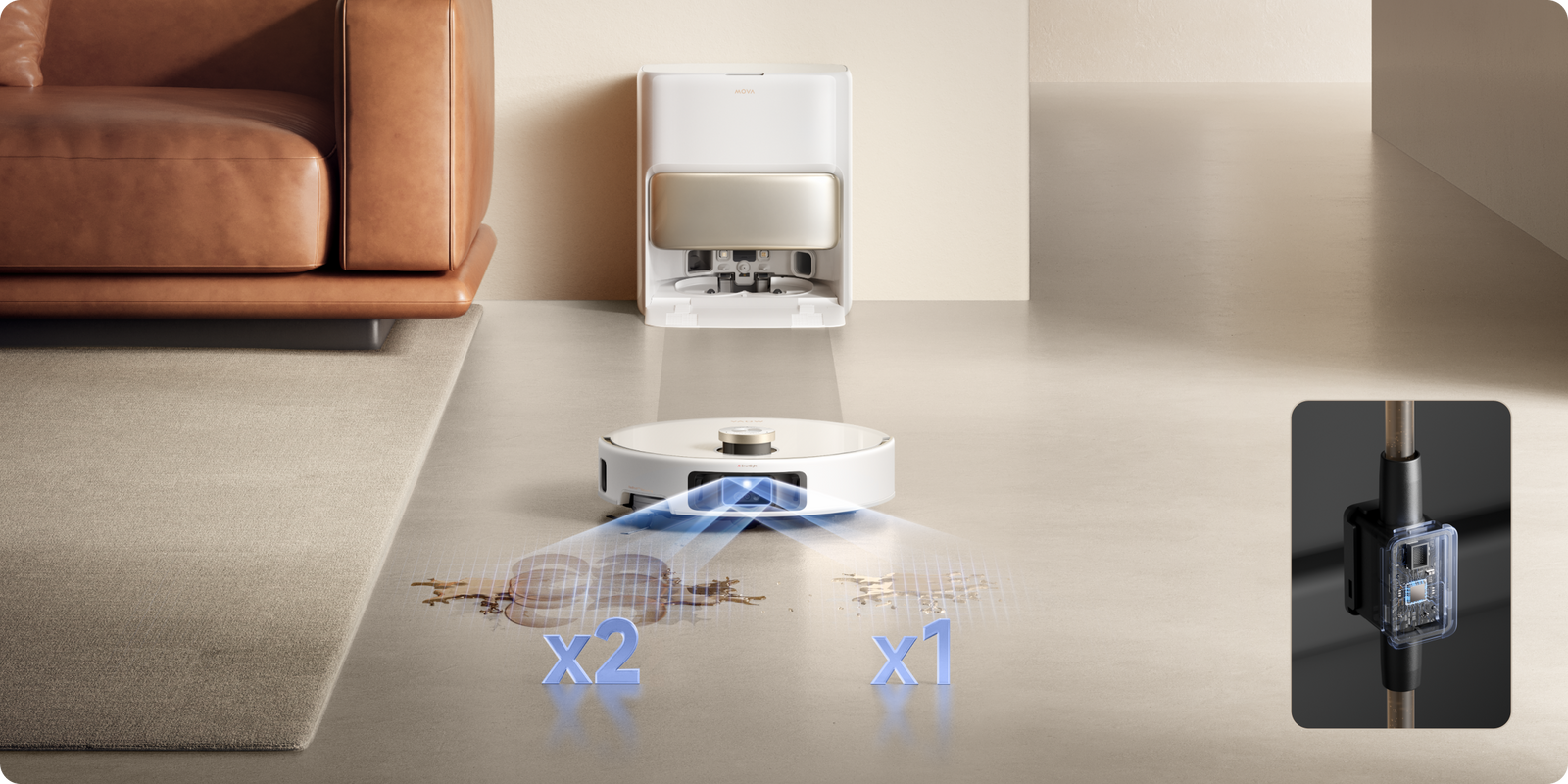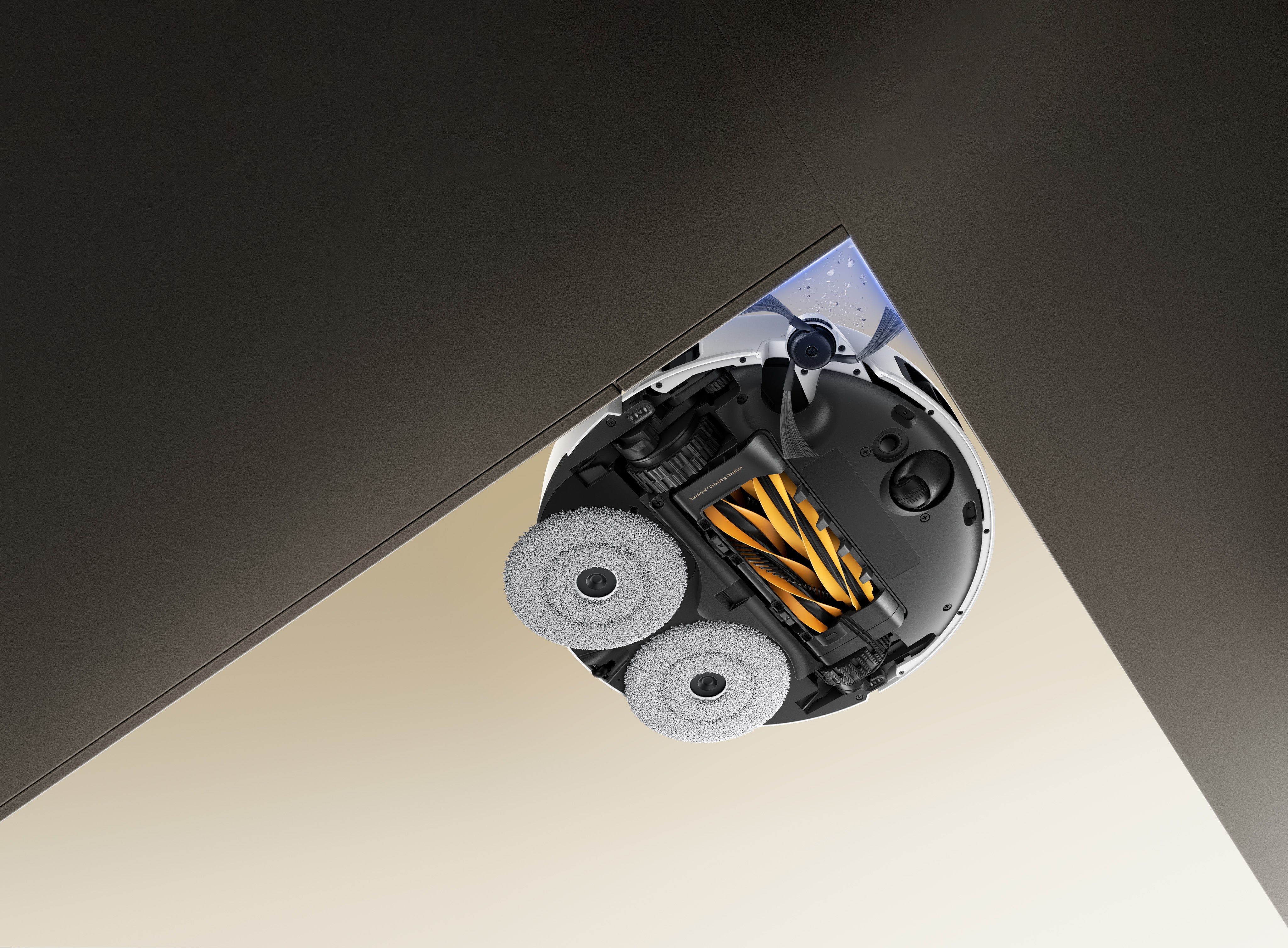 Navíc, když překračuje prahy, hlavní a boční kartáč i mop se zvedají, aby přechod usnadnily.