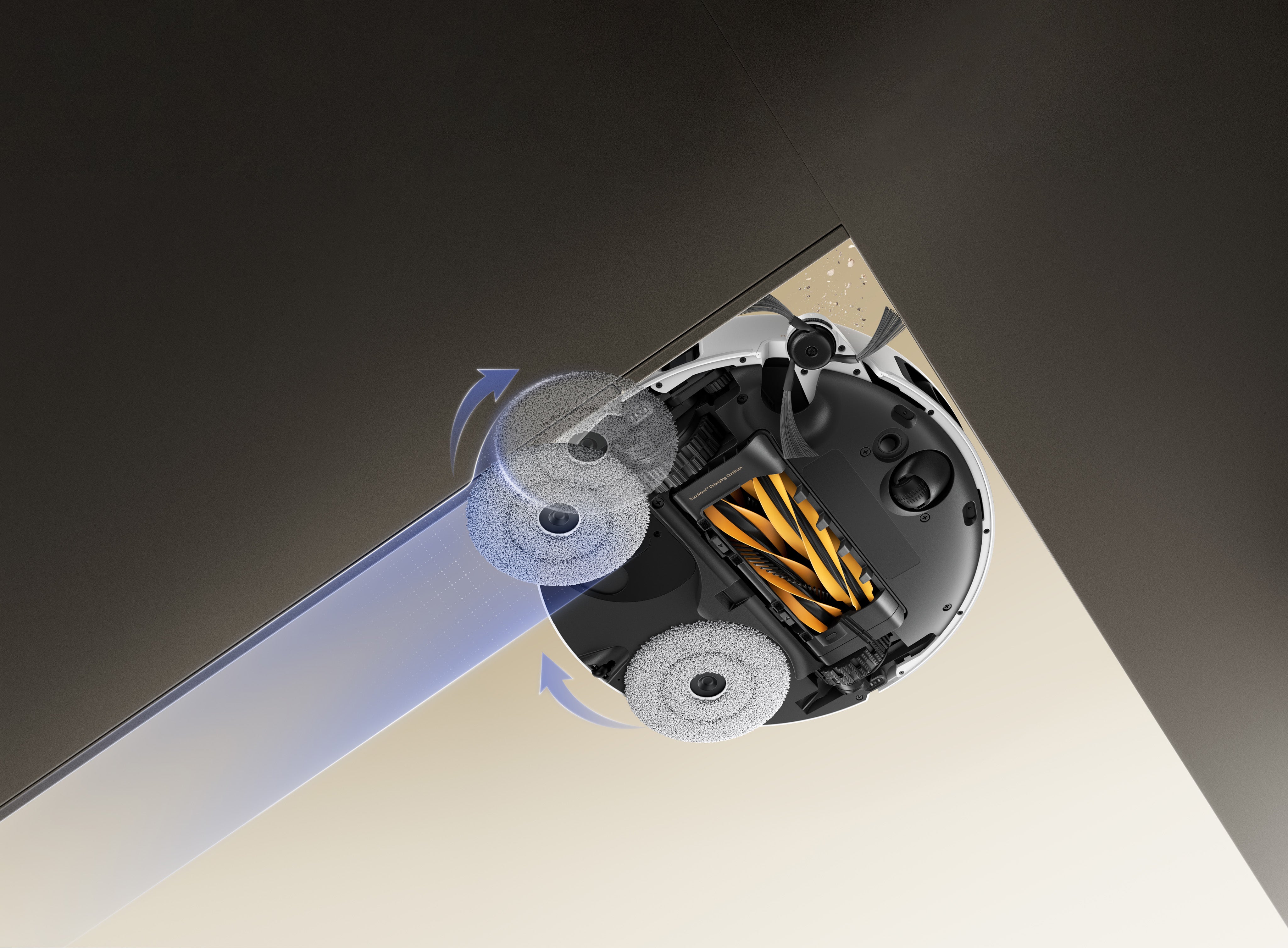 Navíc, když překračuje prahy, hlavní a boční kartáč i mop se zvedají, aby přechod usnadnily.